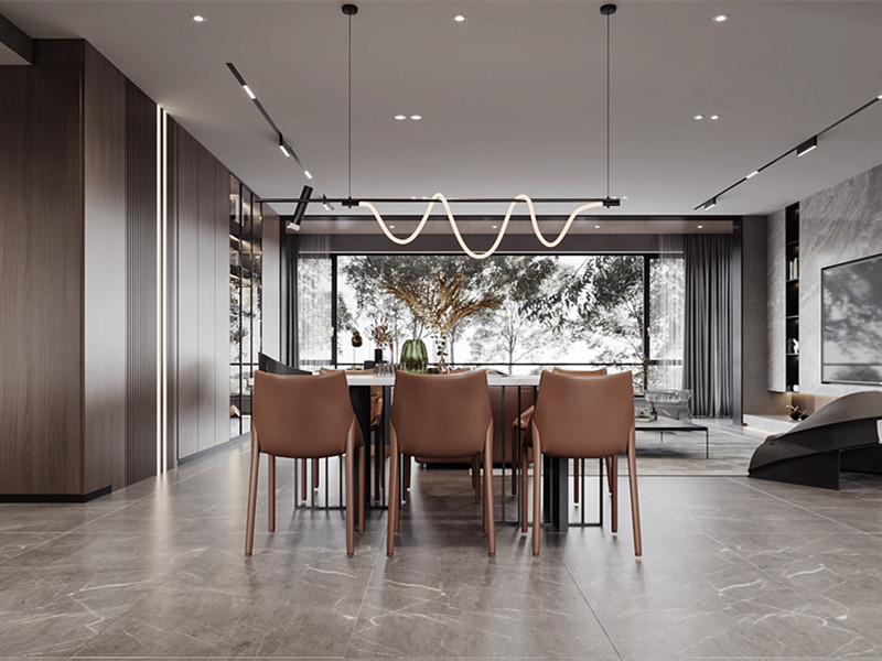 餐厅与客厅一体化的设计,让整体空间展现出宽敞明亮,对于色调延续了客厅的色系为主,黑色和灰色作为表现色,给空间一种大气且利落的氛围感。