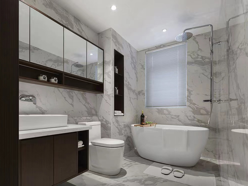 建议镜柜设计得薄一些,不要太深,可以放下一层瓶罐装的护肤品就可以,这样拿取物品会方便很多。另外,建议做好隐藏灯带等设计,满足洗漱区的照明需求。