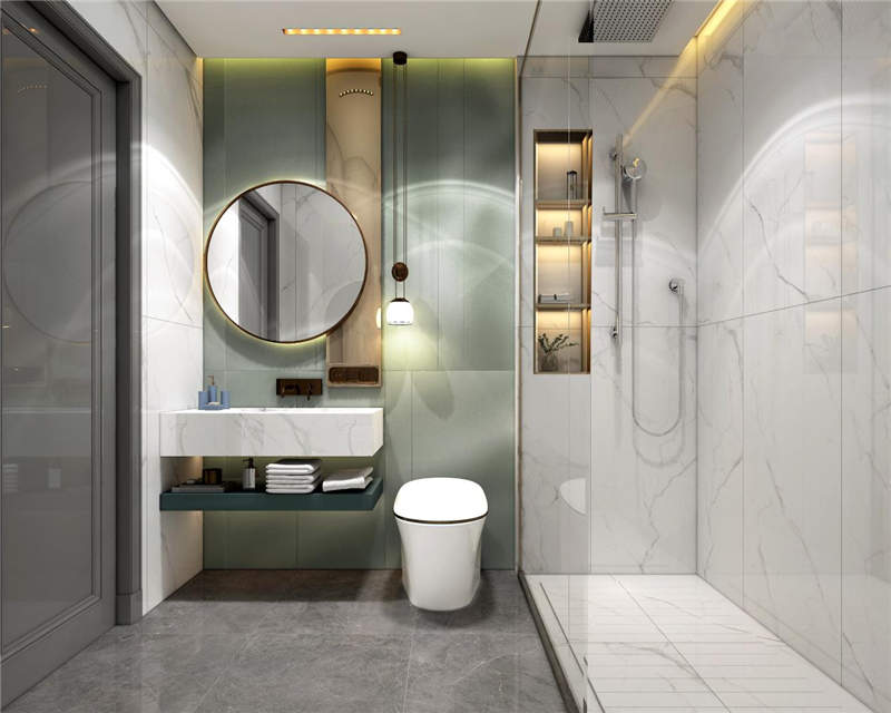 如果追求空间个性化,可以考虑做多色拼接设计,在洗漱区、马桶区、淋浴区等部分区域采用点缀色,既能起到划分功能区的作用,也能给空间增添更多的层次感和趣味性。