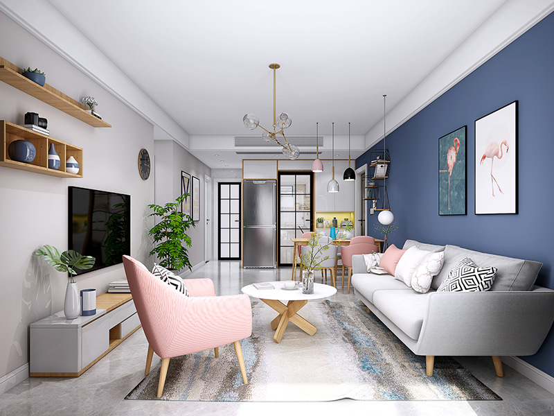 本案基于简约风格进行家居设计,以黑白灰为空间色彩基调,局部融入粉蓝等鲜明色彩,并结合开放式布局、通透隔断等,呈现简雅恬静的现代居室。
