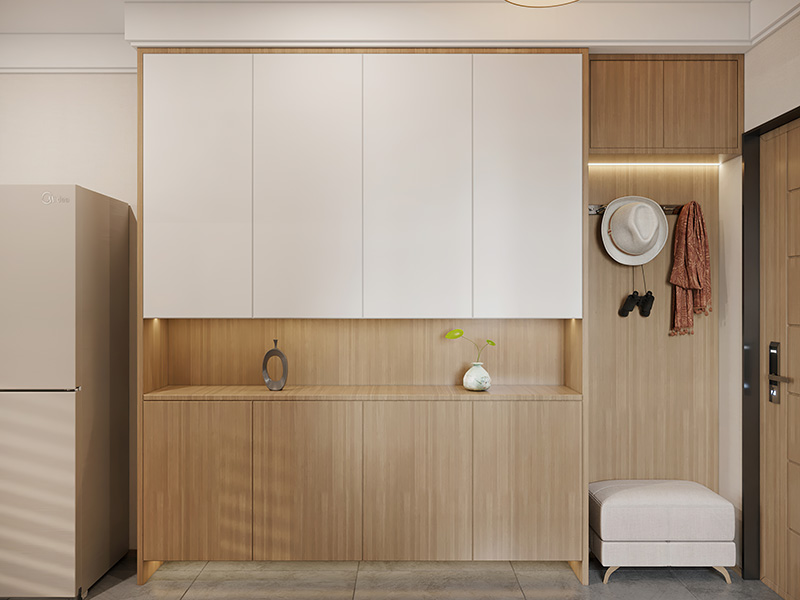 巧用玄关区域的活动空间,设计玄关柜+落尘区,既方便收纳家庭成员的鞋包等物品,又避免灰尘被带到室内,保持家居的整洁有序。