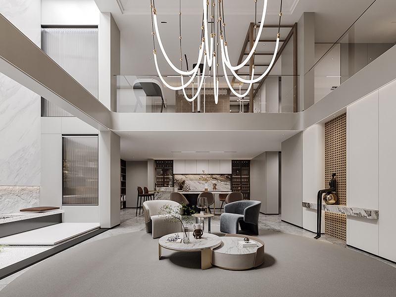 本案是别墅户型,基于当下的审美和技艺,巧用空间布局、色彩搭配和材质差异等,呈现时尚轻奢的现代舒适家居。