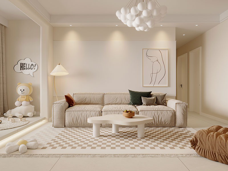 本案以奶油色系串联,借金属灯具、艺术挂画等细节注入设计质感,既满足现代家庭社交、休憩、学习等多元生活需求,又诠释“治愈感与设计感共生”的奶油居家美学。