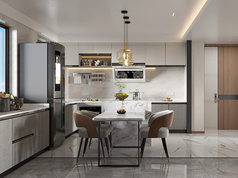 餐厅和厨房均采用开放式布局,用岛台餐桌做连接,既明确功能区域的划分,又增加实用性,呈现餐厨一体布局。
