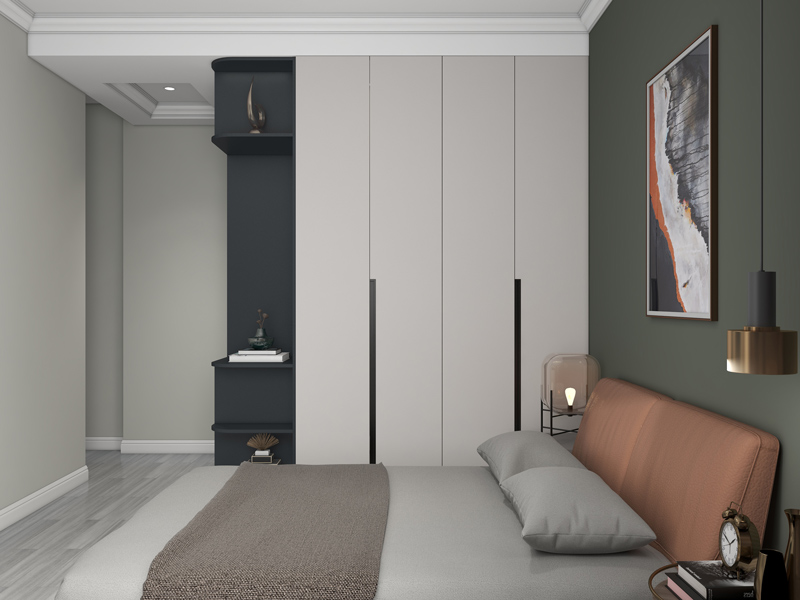 次卧布局收纳衣柜紧凑实用,低调稳重的色彩搭配让视觉上更加有格调,不对称床头设计精致时尚。
