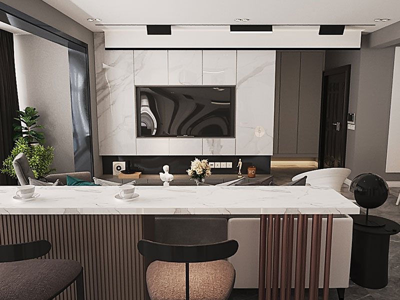 于沙发背景墙融入收纳设计,半隐藏柜半开放格的布局形式,呈现储物与美学的视觉平衡。搭配吧台,呈现开放式工作区,也可做下午茶餐桌等使用。