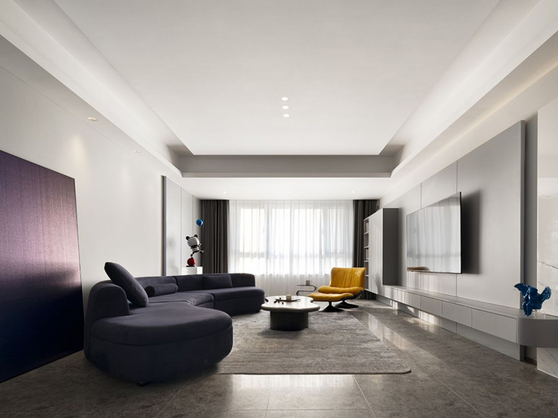 客厅轻松传达出现代极简的生活氛围,色块的碰撞避免单调,悬空电视柜搭配局部置物设计,简洁实用。