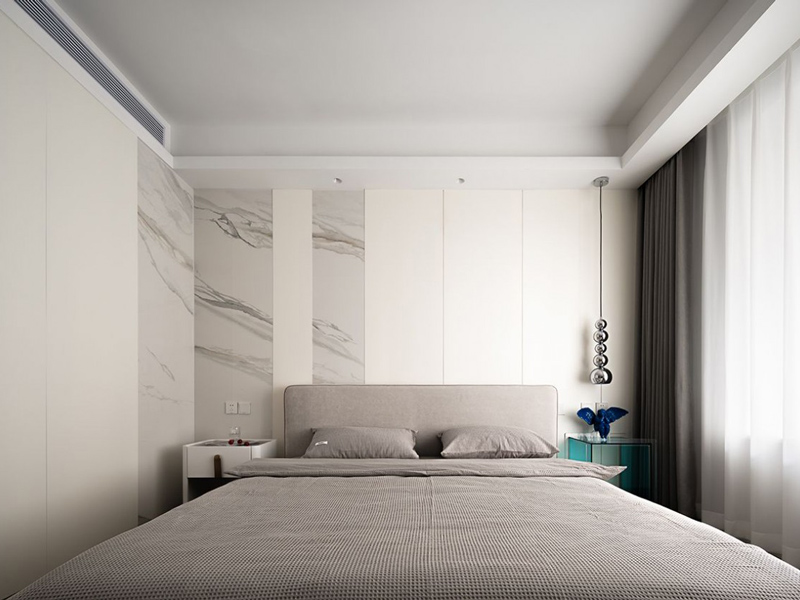 主卧局部大理石纹理拼接设计背景墙丰富空间美感,层次更和谐自然,清爽的白灰色系软装朴素静谧。