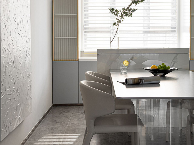 餐厅区域采用岛台一体设计,饱满实用,增添操作台面,使用更舒适便捷,增设餐边柜,满足了收纳需求。