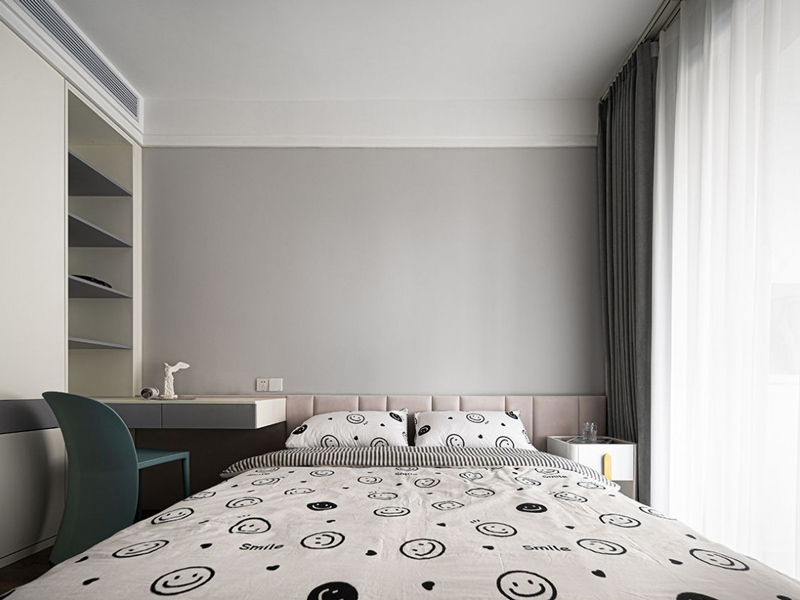 次卧定制衣柜,合理利用有限空间,兼具书桌、衣柜的功能,提升整体实用性,整洁利落避免视觉单调。