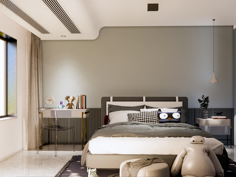 儿童房通过装饰摆件来提升区域活力感,简洁的基础设计使空间更显沉稳,布局书桌满足生活办公学习需求。