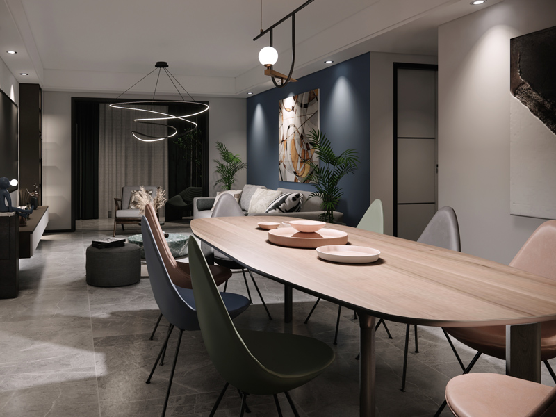 餐厅区域材质选择自然舒缓,木质餐桌搭配皮质座椅,创意十足的同时不失和谐,彩色搭配整体更灵动。