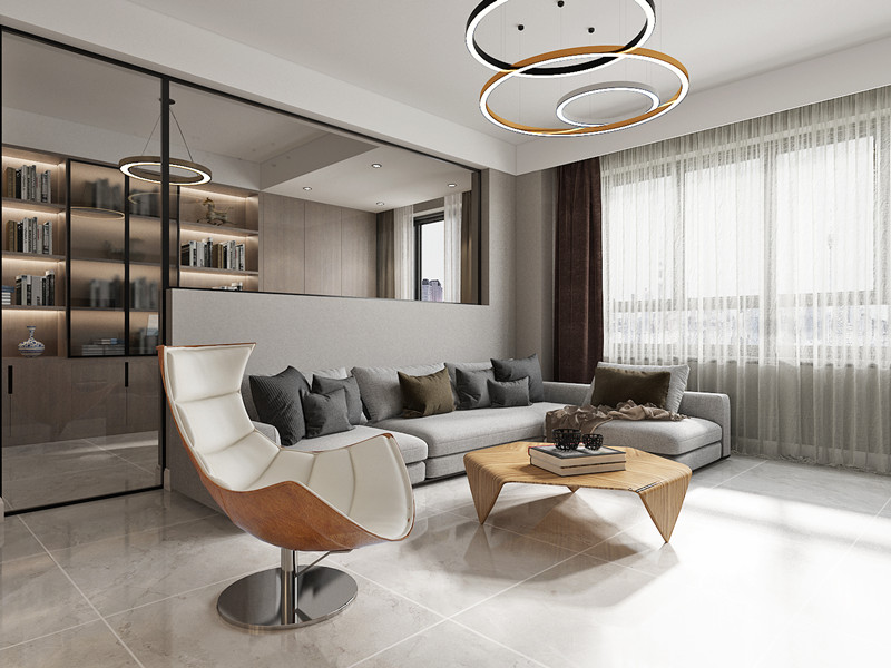 不同以往的背景墙设计,没有采用传统墙面作为背景墙,运用玻璃墙将客厅与书房就闹心空间分割,增强了两个空间的通透性也划分出了不同功能的空间区域。