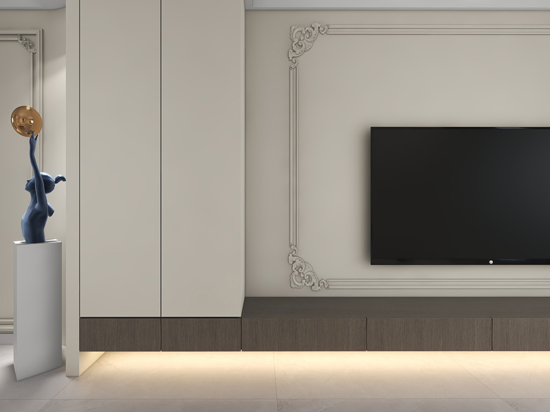 客厅区域采用悬空电视柜设计,简洁现代,通过灯带的融入增添区域氛围感,兼具实用性与美观性。
