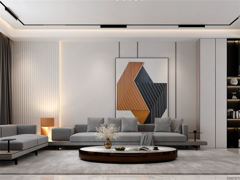 沙发墙采用硬包设计,搭配灰色调组合沙发和圆形茶几等,将极简美学和轻奢格调相融合,优雅且时尚。