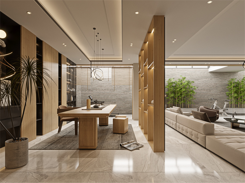 以温润的木色为主调,搭配淡雅的米白色,营造出宁静而大气的氛围。家具简洁且有中式韵味,沙发、茶几的线条利落,与空间相得益彰。