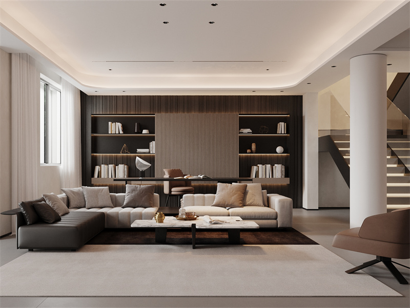 横厅布局空间开阔,沙发组合围合出交流区,后侧布局办公区,可在此阅读、办公,靠墙设书架,兼顾休闲与学习。