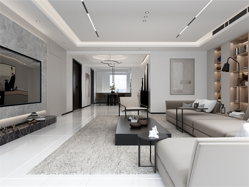 以中性色为基调,沉稳大气。浅灰沙发搭配黑白灰地毯,层次分明。背景墙置物架嵌入暖光,陈列藏品。日常可在此休闲娱乐、接待亲友,享受自在时光。