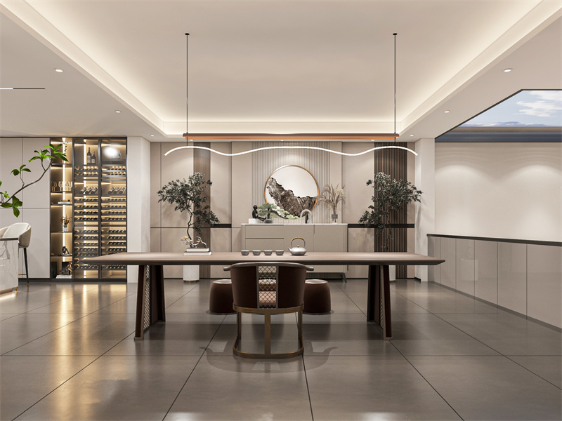 茶室弥漫着新中式格调,长形茶桌采用深色木质,纹理细腻,尽显古朴质感。背景处,圆形装饰画中呈现的山水景致,与两侧的绿植相互呼应,营造出自然宁静的氛围。