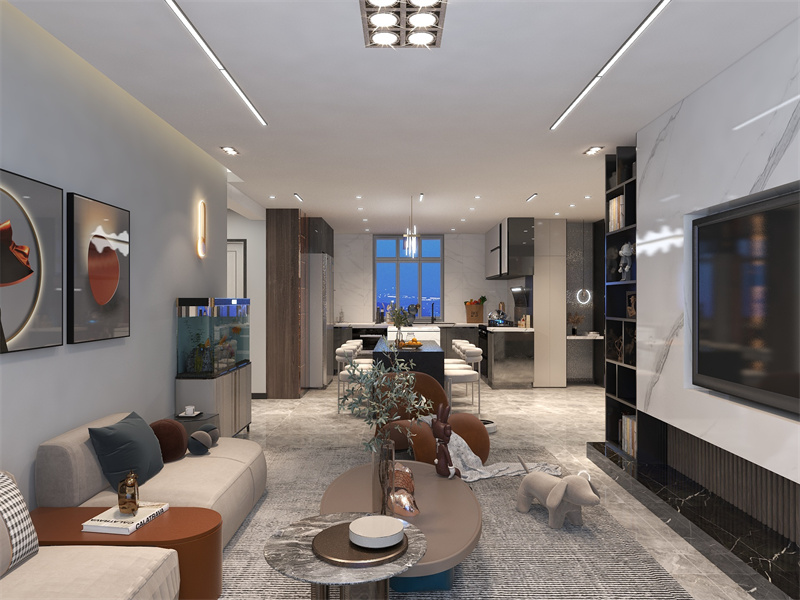 本案客厅尽显现代简约格调。以浅灰、米白为主色调,搭配棕、蓝等色彩的软装,丰富视觉层次。无主灯设计搭配线性灯,营造出简洁大气的氛围。