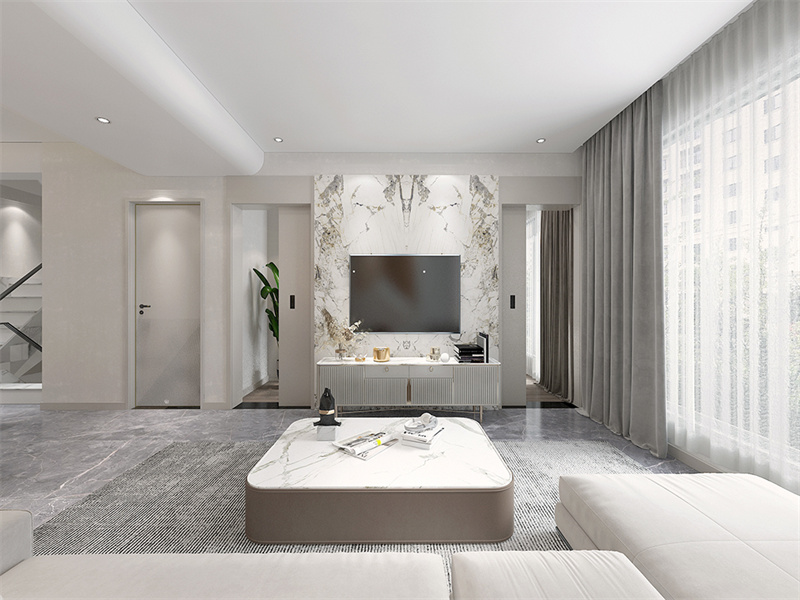 以白色为主调,搭配浅灰与棕色软装,营造宁静温馨氛围。简洁的沙发、大理石茶几,线条利落。无主灯设计让光线柔和均匀。开放式布局连接餐厅,适合日常休闲、家庭聚会,满足多元居家生活需求。