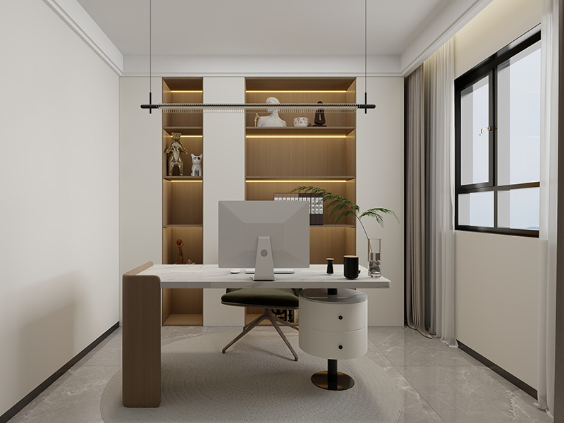 浅木色书柜与白色墙面搭配,营造明亮静谧的阅读办公环境。自然光透过窗户照亮空间,适合专注工作或沉浸阅读,让学习工作充满乐趣。