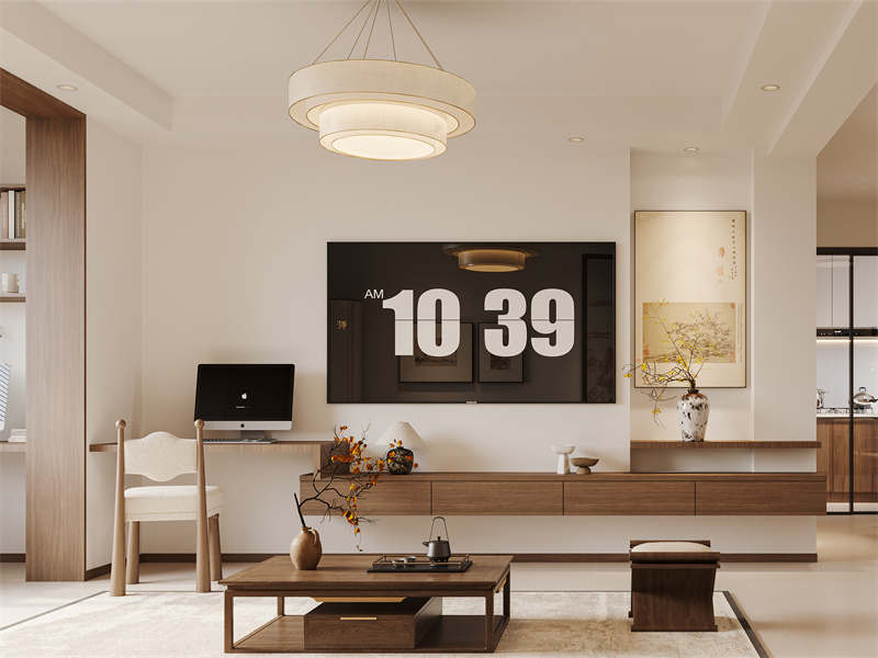 电视墙与木质家具搭配,自然简洁。悬空电视柜搭配中式挂画,碰撞传统与现代,色彩上,米白墙面搭配原木色调,温馨舒适。同时在旁边打造出办公区域,合理利用空间,整体设计放松实用。