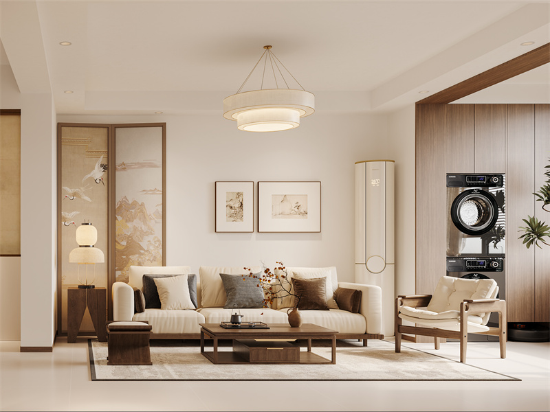 空间布局经典,沙发茶几围合出舒适交流区。沙发、挂画、屏风处处透着古韵。浅米色墙面搭配木质元素,温暖自然,呈现雅致的居家生活。洗衣机嵌入式布局阳台区域,打造便捷的生活方式。