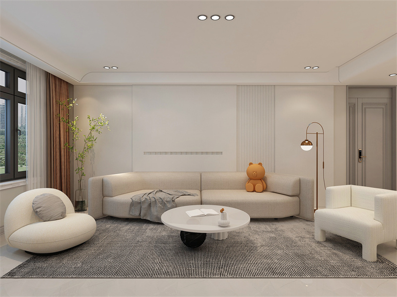 以白、浅灰为底色,构建简洁通透场域。悬浮式电视墙嵌入灯带,弱化柜体边界,弧形元素柔化空间,用极简线条勾勒松弛生活节奏。