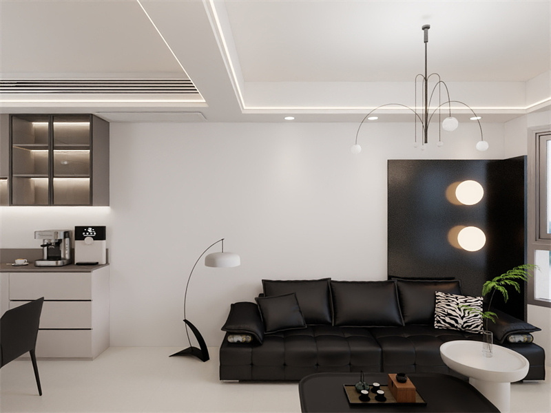 白色墙面与黑色皮质沙发碰撞出强烈视觉张力。弧形落地灯、几何造型吊灯丰富空间曲线,黑色隔断墙嵌入圆形灯,构建出艺术感十足的会客区域,绿植融入点缀打破冷调。