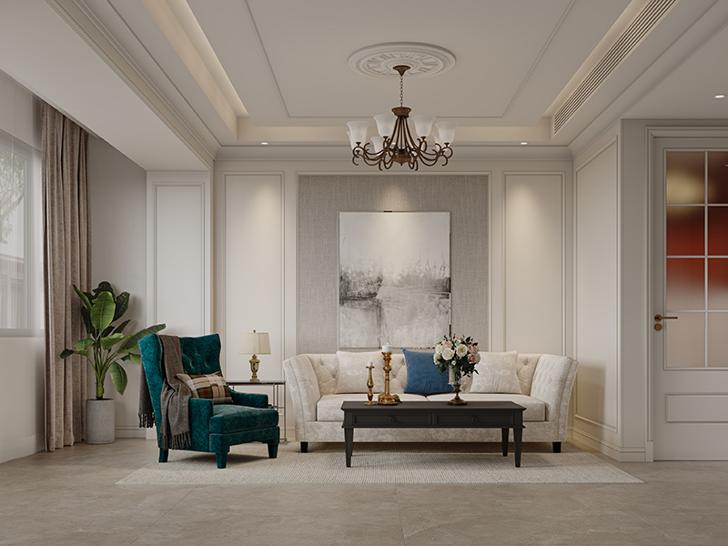 以米白色系为主色调,护墙板勾勒空间层次,复古吊灯呼应美式底蕴。无主灯设计借壁灯营造温馨,适配家庭观影、闲适聊天,以简洁线条与经典配色,传递美式风格的自在与包容。