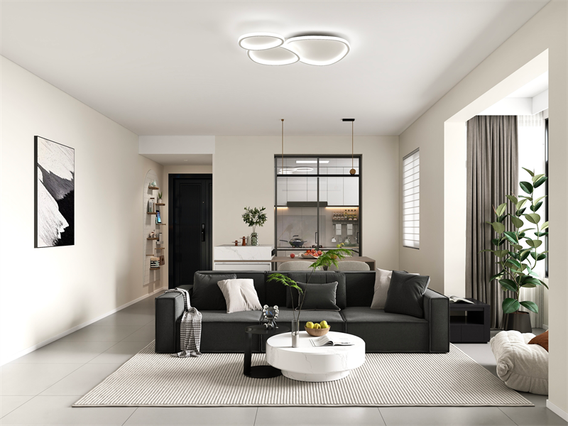 深灰沙发与浅墙形成对比,异形茶几、圆润灯具柔化线条。开放式餐厨通过玻璃隔断联动,艺术挂画、绿植点缀平衡理性秩序,无主灯设计借组合顶灯营造松弛氛围。
