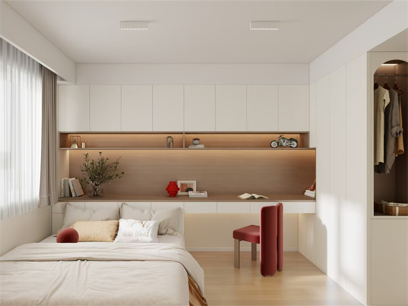 浅白与原木交织,营造温润治愈氛围。一体化书桌与柜体,借灯带点亮收纳与展示,绿植、小摆件点缀,平衡功能实用与生活美学,构建出休憩与阅读共生的小天地,诠释现代小空间的有效利用。
