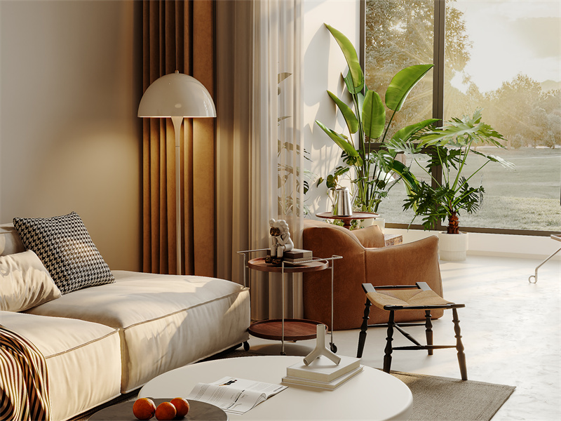 沙发、桌椅摆放错落有致,营造出舒适的交流区域。居家时可慵懒窝在沙发,也能在休闲椅上静享时光。色彩以暖米色为主,搭配棕色家具,温馨和谐。装饰画、绿植点缀,让生活充满艺术氛围与自然气息。
