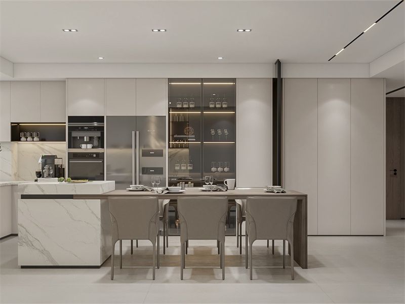 浅米橱柜嵌岩板中岛,开放格酒柜藏暖光灯带。岩板冷调与木色暖韵碰撞,极简布局让烹饪、用餐与互动自然流转,烟火气透着利落秩序。