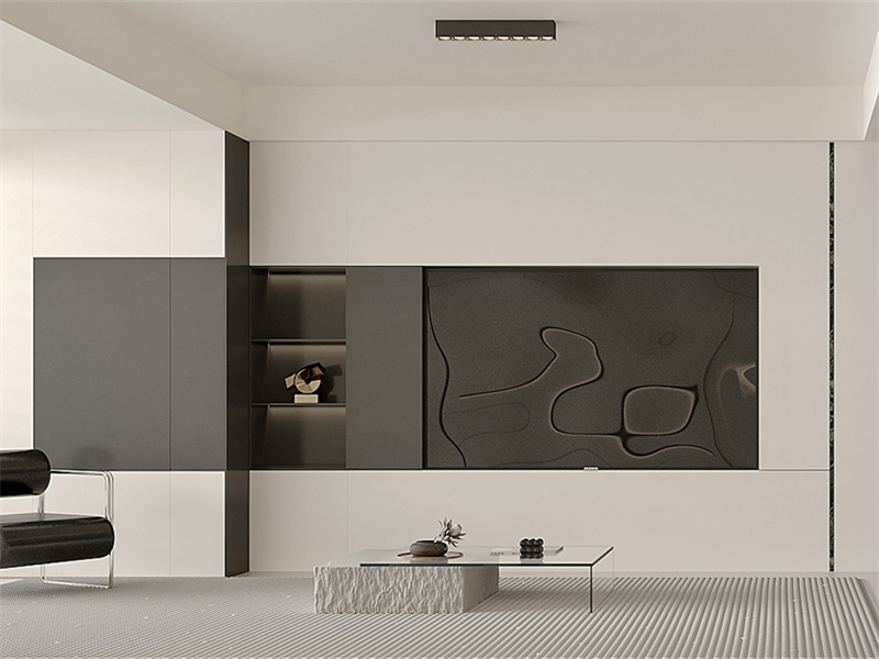 以黑白灰为主色调,打造出极简且富有品质感的氛围。电视背景墙的立体造型设计,增添了空间的艺术感与层次感,嵌入式收纳与简洁的茶几组合和谐美观。
