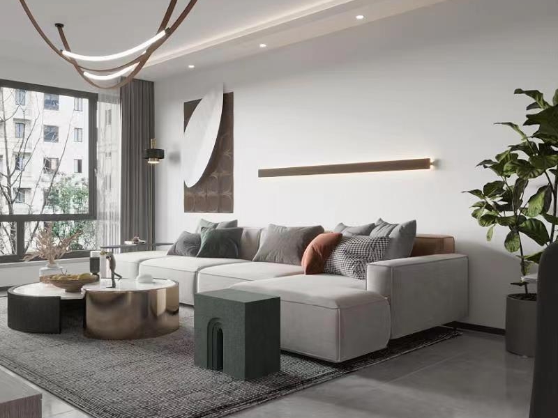 客厅将现代与自然揉成诗意,米白沙发、撞色抱枕铺展舒适,弧形吊灯如艺术丝带悬于空中。绿植舒展生机,圆形与方块茶几相映成趣,每一处都写满 “松弛感”,适配亲友畅聊、独处静思等多元生活场景。