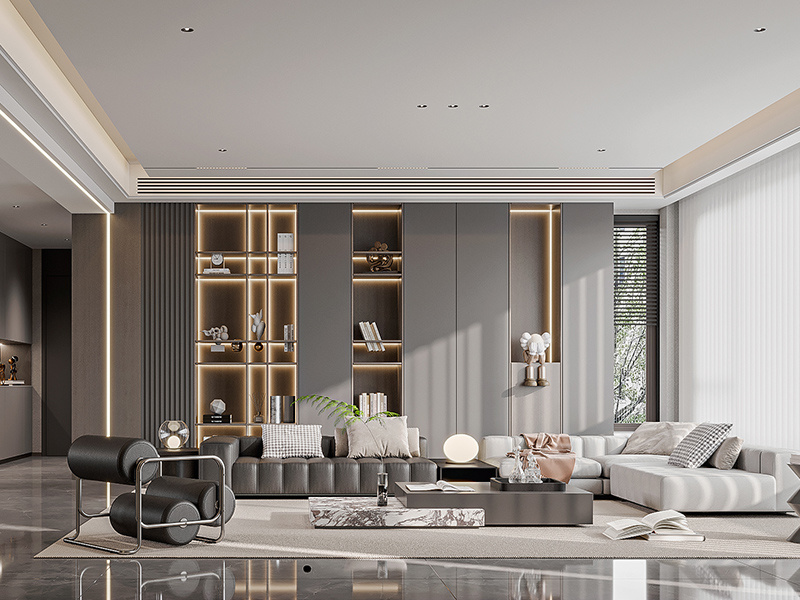 以灰、棕等中性色为主,搭配大理石与皮质元素,尽显意式极简的高雅感。宽敞的空间、简洁的家具,适合家人休闲观影,也可作为社交场所,传递出优雅从容的居家生活格调。