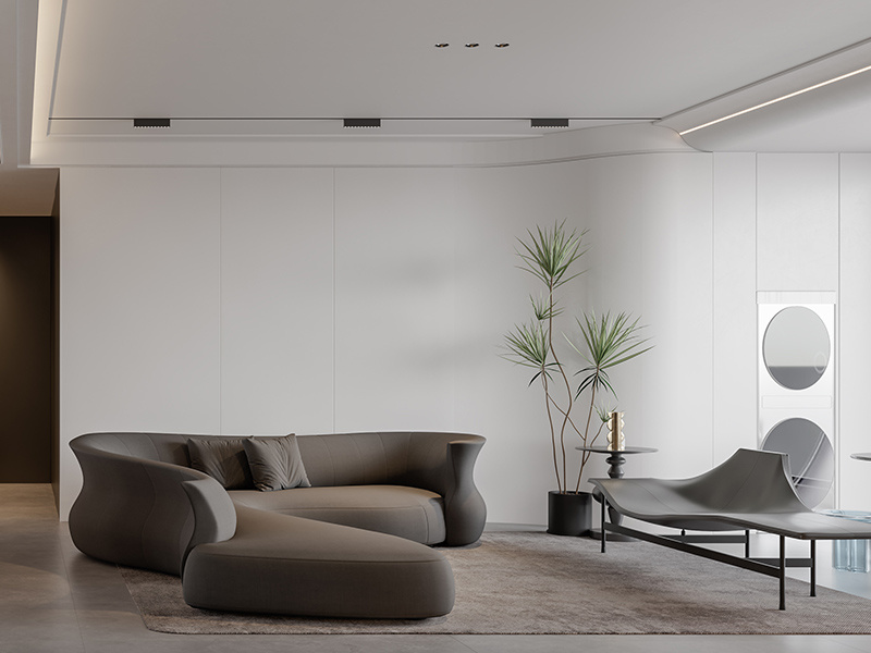 以灰、白为主色调,搭配简约线条与利落布局,营造出开阔通透的氛围。舒适的躺椅、精致的装饰摆件,适合家人休闲观影,也可在此放松身心,彰显现代简约的舒适与大气。