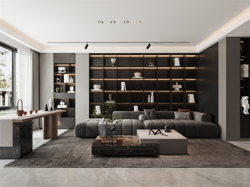 深色收纳墙辅以暖光,既满足海量储物,又成艺术展示区。搭配柔软大沙发,家人可在此放松休憩、亲友能围坐交流,于现代简约的质感里,营造出温馨互动的生活场景。
