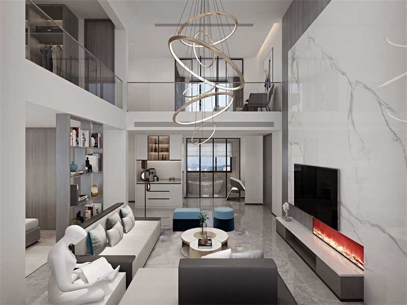 挑空结构结合极简设计语言,米白与木色相互映衬,环形艺术吊灯增添精致感。大面积窗户借景室外,空间既适合亲友聚会交流,也能让人独自享受开阔感,于极简中传递出大气与惬意。