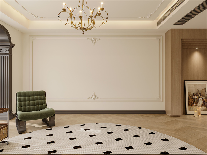 以米白为基底,搭配复古铜色吊灯、雕花墙面,弧形奶油色沙发柔和圆润,墨绿色单人椅点睛。家人可围坐闲聊,或推藤编边几分享咖啡,复古画框与壁灯交织,营造出法式沙龙般的慵懒社交氛围。