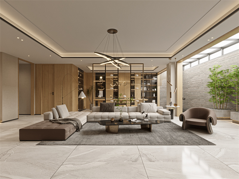 以木色为基调,融合现代线条,暖光收纳墙与艺术吊灯相衬,浅灰沙发搭配绿植,营造出兼具东方自然质感与现代舒适的社交空间,家人围坐或待客,皆能感受雅致氛围。