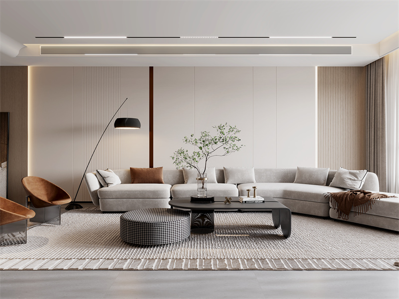 本案以现代风格为核心,选取米白、暖棕、黑白灰等有质感的色调贯穿空间。整体在利落线条与质感材质的融合中,传递出兼具舒适与现代美学的居家氛围。