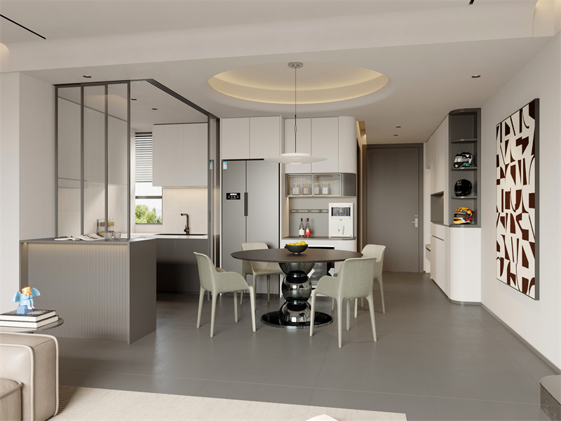 以白、浅灰为主色调,大窗引入充足自然光线,简洁柜体与柔和沙发搭配,线条简约利落。日常休闲或待客时,自然色调与简约家具交融,既彰显现代设计的干练感,又营造出松弛自在的互动氛围,适配多元居家场景。