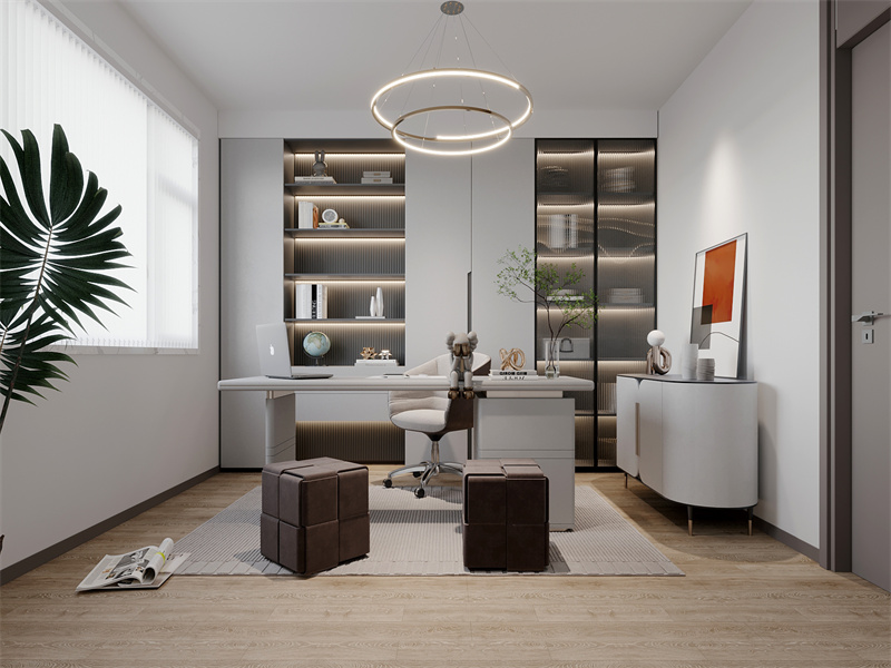 以白色为主调,木色地板柔化氛围,简约环形灯与带灯收纳柜提升精致感。日常可在此办公、阅读,空间利落无冗余,白色的清爽与木色的温暖碰撞,既满足效率工作的需求,又借绿植与艺术陈设营造出雅致的学习场域,适配现代居家的知识汲取与思维沉淀。