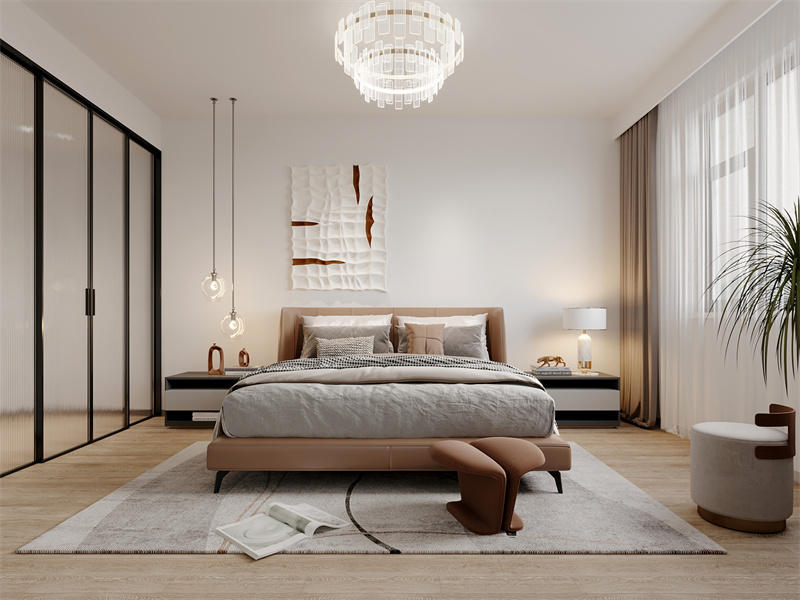 米白、木色与浅棕交融出温馨氛围,玻璃衣柜显收纳,简约吊灯与艺术挂画点缀精致。休憩时,色彩柔和静谧,布局简洁无扰,既满足深度睡眠的私域需求,又借利落收纳设计实现衣物有序整理。