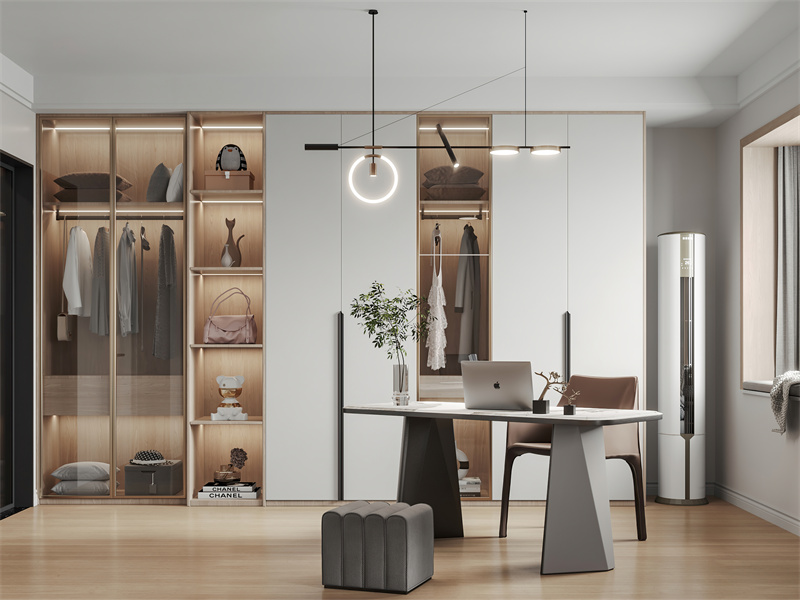 玻璃与木饰面结合的衣帽间内嵌灯光,兼具收纳与展示功能。书桌造型简约大气,搭配质感座椅,窗边自然光充足,营造出静谧雅致的办公场景。
