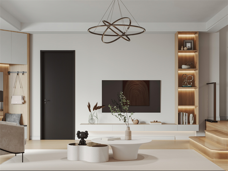 浅色调基底搭配深色门体形成层次。定制展示柜内嵌灯光,兼具收纳与装饰功能,设计感突出。灯光与自然光结合,打造出舒适且具格调的休闲环境。