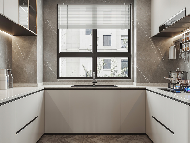 白灰配色柜体搭配大理石纹理墙面,质感干净利落。大窗保障通风采光,兼顾烹饪实用性与视觉清爽感。嵌入式厨电提升空间整洁度,分区清晰。